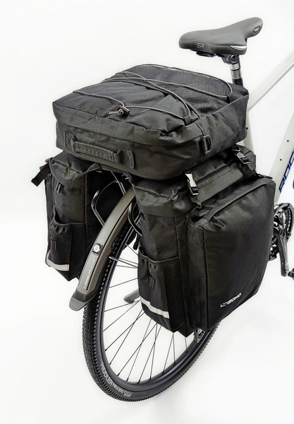 Wielofunkcyjna, potrójna torba rowerowa, zaczepiana na bagażnik. Idealne sprawdzi się jako schowek na narzędzia rowerowe, drobne rzeczy przydatne podczas podróży, ubrania, mapy lub zapas pożywienia.