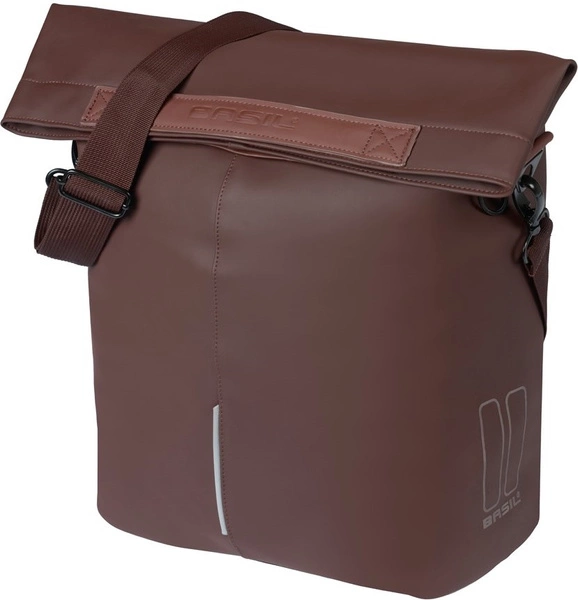 Sakwa Basil City Shopper to idealna sakwa zakupowa na rower, która pasuje do eleganckiego stylu miasta: praca, spotkania ze znajomymi, wyjścia, wypad na targ czy po prostu relaks po godzinie jogi. Ta sakwa jest nie za ciężka, nie za duża, a jednocześnie pojemna (14 do 16 litrów) i wystarczająco mocna, by unieść wiele codziennych niezbędników. Sakwa posiada wodoodporne składane zamknięcie z magnesem, które zapobiega wlewaniu się deszczu do środka. Dzięki hakom MIK (MIK Hooks) możesz łatwo przymocować sakwę do bagażnika jednym szybkim ruchem i równie łatwo ją odczepić, a dzięki odpinanemu paskowi można ją równie swobodnie nosić na ramieniu. Wygodnie przeniesiesz sakwę dzięki uchwytom wykonanym ze skóry wegańskiej. Sakwa ma wewnętrzną kieszeń zapinaną na zamek błyskawiczny oraz opcję mocowania oświetlenia LED.