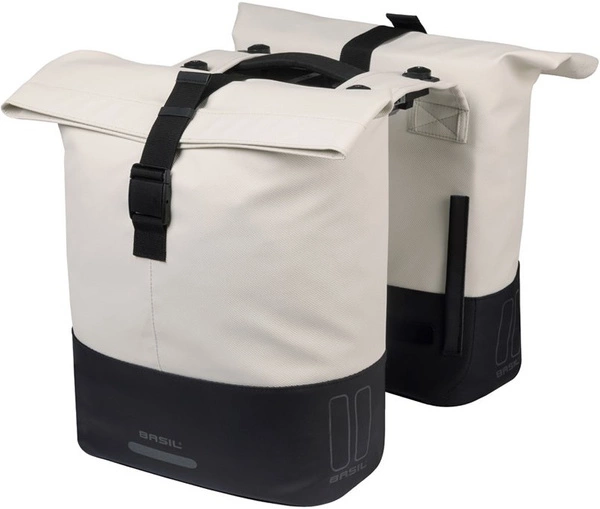 Sakwa podwójna Basil Cove została zaprojektowana dla tych, którzy są w ciągłym ruchu każdego dnia i szukają niezawodnej, stylowej sakwy rowerowej. Od zakupów spożywczych i dojazdów do pracy, po wycieczki z rodziną – ta podwójna sakwa bez wysiłku towarzyszy Ci przez cały dzień. Stonowana kombinacja kolorów ecru/czarny nadaje Twojemu rowerowi nowoczesny, spokojny wygląd, który pasuje do każdego stylu. Dzięki czystym liniom, dwukolorowemu wzornictwu i uniseksowemu charakterowi, Basil Cove idealnie pasuje do aktywnego, miejskiego stylu życia. Sakwa wygląda elegancko, a jednocześnie emanuje solidnością i stylem, będąc prawdziwie wszechstronną opcją dla każdego, kto ceni funkcjonalną, a zarazem piękną sakwę. Sakwa oferuje pojemność od 28 do 32 litrów, podzieloną na dwie przestronne komory główne. Dzięki wodoodpornemu składanemu zamknięciu z klamrą, Twoje rzeczy pozostają dobrze chronione. Sprytnie rozmieszczone paski na rzepy zapewniają stabilność podczas jazdy, a sakwa jest również kompatybilna ze wspornikiem Basil Distance Holder dla dodatkowego bezpieczeństwa. Mocowanie sakwy podwójnej Basil Cove MIK jest łatwe dzięki fabrycznie zamontowanej płytce adapterowej MIK, która zawiera poręczną funkcję blokowania dla dodatkowego bezpieczeństwa. Jeśli chcesz zmienić akcesoria, na przykład na koszyk, możesz łatwo odpiąć sakwę od bagażnika. Nie masz bagażnika MIK na swoim rowerze (elektrycznym)? Żaden problem! Wystarczy zamontować płytkę MIK Carrier Plate na swoim bagażniku. Basil Cove jest wykonana z recyklingowanego PET z akcentami ze skóry wegańskiej i jest całkowicie wolna od PFAS. Materiał jest wodoodporny, mocny i trwały, gotowy do intensywnego codziennego użytkowania. Po prostu stylowa, gotowa do rowerowej radości.